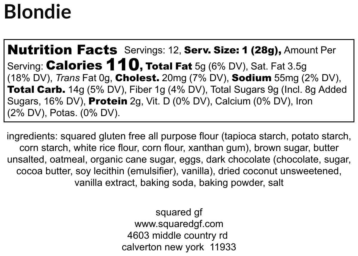 Ingredients: Organic sugar, grass-fed butter, free-range eggs, non-GMO gluten-free flour blend (potato starch, tapioca starch, corn starch, corn flour, white rice flour, xanthan gum), shredded coconut, dark chocolate chips (cocoa mass, sugar, cocoa butter, vanilla), vanilla extract.