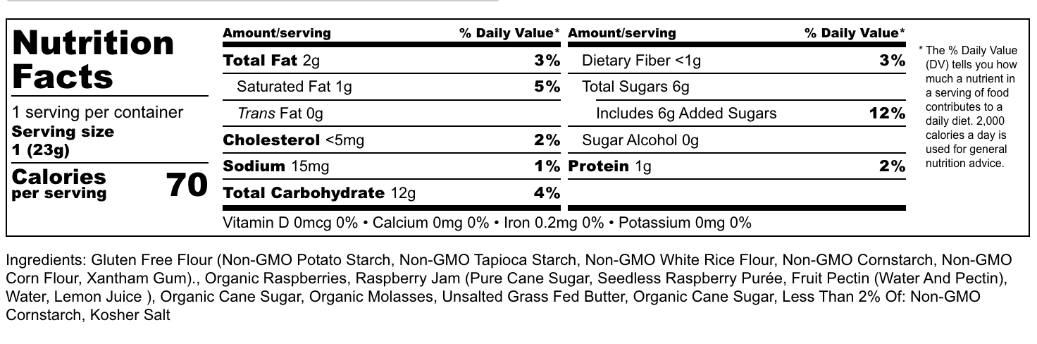 Ingredients: Organic sugar, grass-fed butter, free-range eggs, non-GMO gluten-free flour blend (potato starch, tapioca starch, corn starch, corn flour, white rice flour, xanthan gum), organic raspberry jam, organic raspberries, brown sugar.